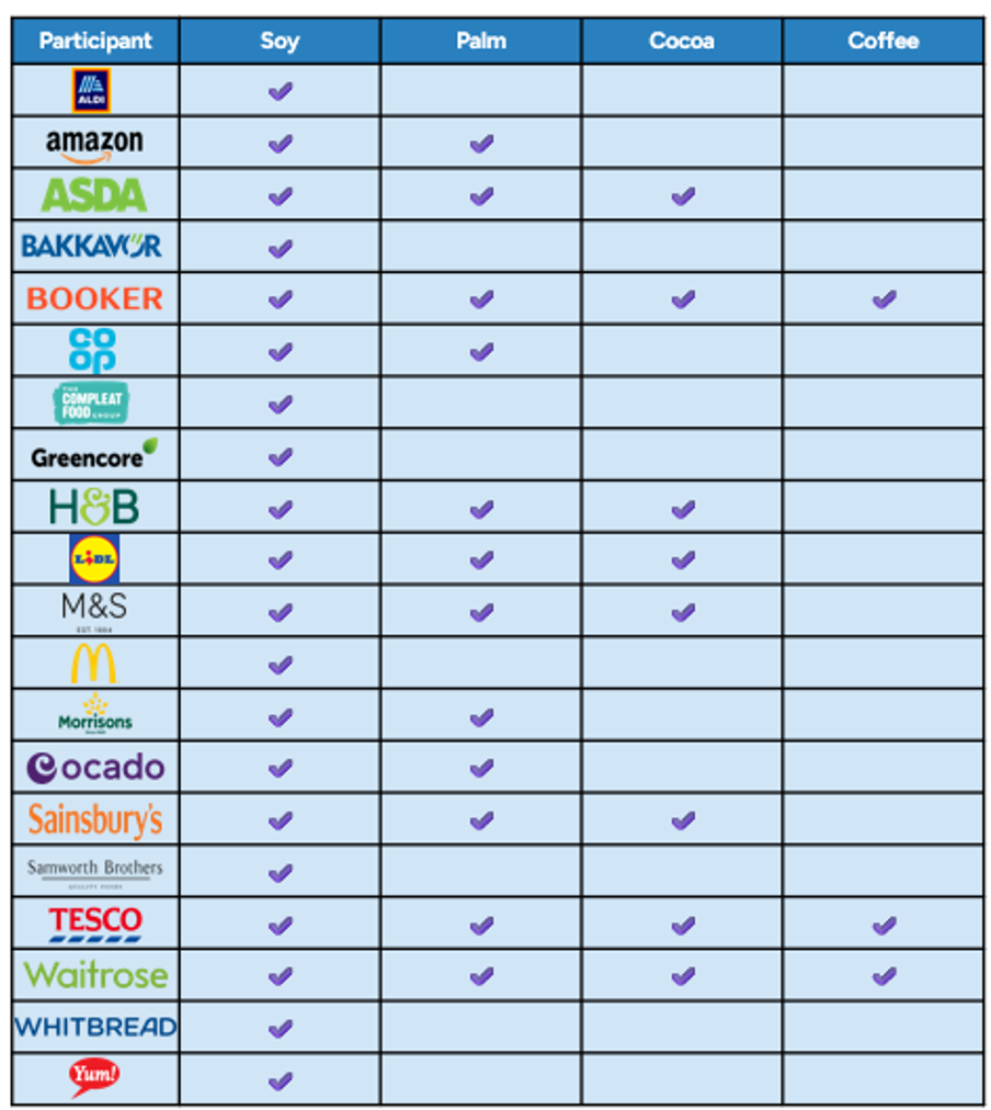 Below is the full list of companies taking part in the reporting process for this year and the commodities they are requesting data on. If you believe you should be reporting for any additional customers, please let our support team know.